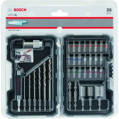 The Extra-Hard Screwdriver Bit Set, 35-Piece is a good choice for universal use. This complete set contains accessories for important drilling and screw-driving applications. The screwdriver bits are composed of S2 Modified Steel and an optimised heat treatment process, which provides an extra-hard quality that delivers a strong performance for all tasks. They also feature a tapered torsion zone that easily handles torque peaks by absorbing force and vibrations. All bits are colour-coded for quick viewing and identification of the appropriate bit type. Furthermore, the set contains precision-ground drill bits made of HSS (high-speed steel), which enable a fast drilling rate in metal and plastics. They have a 1/4-inch external hex shank for use with screwdrivers and drill drivers. It has a 1/4-inch external hex shank and is intended for universal screw-driving with screwdrivers and drill drivers. Furthermore, the set contains precision-ground drill bits made of HSS (high-speed steel),