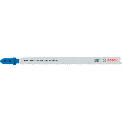 Features: Designed for cutting metal pipes and profiles Long Life cutting metal pipes and profiles Combines hard teeth and flexible body through Bi-Metal welding: a hardened high-speed steel strip bonded onto a carbon steel body ensures the blade cuts metal effectively. Fits all T-shank jigsaws When you want to use jigsaw to cut metal pipes and profiles you need a blade that’s hard, flexible, and long enough to tackle this type of metal elements effectively. Like the long-lasting PRO Metal Pipes and Profiles T321BF we made for the job. The PRO Metal Pipes and Profiles T321BF Jigsaw Blade is made from Bi-Metal: it has a high-speed steel (HSS) tooth strip bonded with a high-carbon steel (HCS) body. This means it’s durable and has the hardness you need to cut metal pipes and profiles with walls up to 6 mm thick. The blade’s tapered body, thin kerf, and strong milled, wavy-set teeth ensure you get smooth cutting progress. The blade’s extended length allows you to cut pipes and