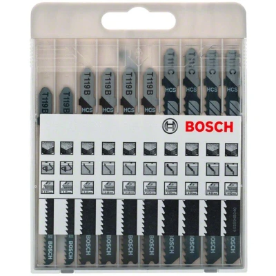 General description The Bosch 2607010629 X-Pro Line Wood Jigsaw Blade Set includes 10 assorted jigsaw blades designed for various wood applications. These blades are particularly effective for softwood, plywood, chipboard, wood core plywood, laminate, fiber boards, and plastics, making them ideal for both straight and curve cuts. Technical specifications Blade Length: 92-100 mm Blade Material: HCS - High Carbon Steel Cut Type: Basic Cutting Action: Basic Cutting Application: Wood Cutting Edge Type: Mill Depth of Cut: 67-74 mm Overall Length: 92-100 mm Number of Pieces: 10 Shank Type: T-shank Tooth Set: Mill Tooth Spacing: 2.0, 1.9-2.3 & 3.0 mm Usage Type: Dry Cutting Compatibility and accessories Compatible with all T-shank jigsaws. Usage These blades are suitable for a variety of cutting tasks in wood, including straight cuts and intricate curves. Other information