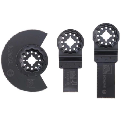 General description The Bosch Starlock Starter Set is designed for general wood and metal applications. The innovative Starlock mount ensures optimum power transfer and allows for a convenient blade change in just 3 seconds. Technical specifications Includes: 1 x AIZ 20 AB BIM Plunge-cutting Metal Blade 1 x AIZ 24 EC HCS Plunge-cutting Wood Blade 1 x ACZ 85 EC HSC Segment Saw Wood Blade