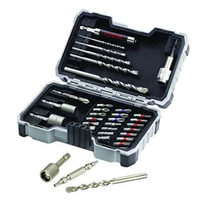 Dimensions: 158x97x76mm Content: 35 pcs With 22 screwdriver bits with handy colour coding making selection quick and easy Suitable for drilling in most materials such as masonry, brick, light building materials, multi-layer materials, ceramics and tiles, wood, plastic, an metals, Weight: 1.212542441 Pounds, Manufacturer: Bosch