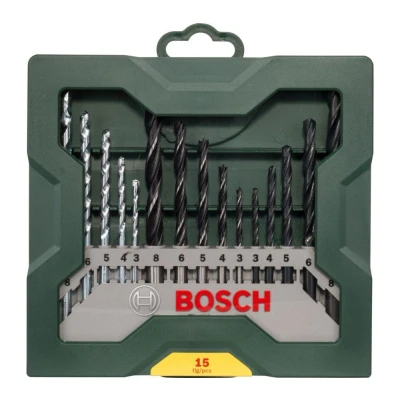 15 Piece Bosch Mini-X-Line Twist Drill Bit Set for drilling in wood, masonry and metal. Suitable for all handheld and stationary drills. Supplied in a practical Bosch X-Line case for a clear layout of the contents. Contains: 5 x Twist Drill Bits for metal, plexiglass and plastics. Size (Ø): 3, 4, 5, 6, 8mm 5 x CYL-1 Masonry Drill Bits for masonry, sand lime bricks, natural stone and cast stone. Size (Ø): 3, 4, 5, 6, 8mm 5 x Brad Point Drill Bits for hard wood, soft wood and plastic. Size (Ø): 3, 4, 5, 6, 8mm