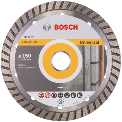 Features: Reliable Cuts Standard for Universal Turbo Diamond Cutting Disc delivers reliable cuts in universal building materials With 22.23 mm bore for standard locking nut angle grinders The Standard for Universal Turbo Diamond Cutting Disc delivers reliable cuts in universal building materials. Its diamond matrix is engineered for cutting various construction components, resulting in well-formed cutting edges. These high-qualitity standards are ensured by the Bosch diamond competence centre in Switzerland. Use this disc when cutting building materials such as concrete and masonry. It is compatible with angle grinders.
