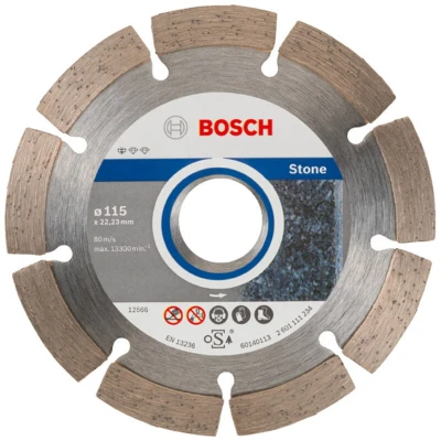 Features: Reliable Cuts in Stone Standard for Stone Diamond Cutting Disc provides reliable cuts in all types of stone With 22.23 mm bore for standard locking nut angle grinders High-quality standards are ensured by Bosch diamond competence centre in Switzerland The Standard for Stone Diamond Cutting Disc provides reliable cuts in all types of stone. Its optimised diamond matrix delivers solid results thanks to the disc's high-quality standards that are ensured by the Bosch diamond competence centre in Switzerland. Use this disc for cutting all sorts of stones. It is compatible with angle grinders.