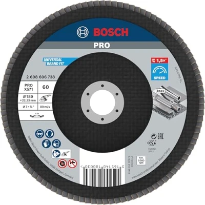 Up to 1.5x faster than a Bosch X431 Flap Disc Highly efficient for metalworkers: Speed With 22.23 mm bore for standard locking nut angle grinders For grinding metal, eg when removing welds and stock on mild steel and stainless steel Scope of delivery: Bosch PRO X571 Flap Disc, 180 mm, G60, Weight: 0.4078551847 Pounds, Manufacturer: Bosch