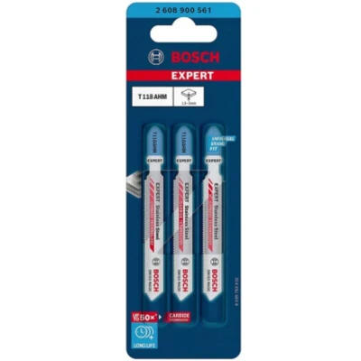 General description Cutting sheets of stainless steel is a daily task for metal workers, and it is also common when fitting kitchens and industrial or office buildings. The Bosch EXPERT Stainless Steel T118 AHM Jigsaw Blade is designed for very thin sheets, featuring a very fine tooth pitch for exceptional durability and long life. With up to 50 times longer life compared to the T118G, this blade is a reliable choice for professionals who need to avoid the frustration of constantly changing blades. Technical specifications Blade length: 83 mm Tooth spacing: 1.1 mm Material: Carbide technology for enhanced durability Usage Ideal for cutting very thin sheets of stainless steel Suitable for professionals working with high-strength steel or pipes with medium to thin walls