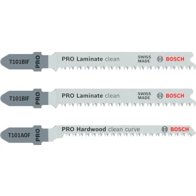 T101BIF for straight cuts, T101AOF for curve cuts Highly efficient for floor layers: Long Life Fits all T-shank jigsaws For efficient straight and curve cuts in laminate materials and hardwood Scope of delivery: Bosch PRO Laminate Set, T-Shank, 3 pcs, Weight: 0.03527396192 Pounds, Manufacturer: Bosch