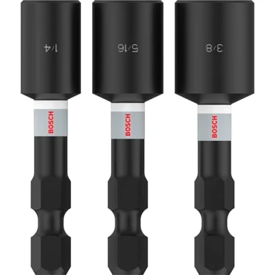 Made from heat-treated modified steel for strength and resistance to high torque Highly efficient for installers, electricians, metalworkers, and woodworkers: Robust 1/4" Impact rated Hex shank for use in impact driver and drill driver For fastening hex screws, nuts, and bolts efficiently, eg when installing all types of panels, equipment, and fixtures Scope of delivery: Bosch PRO Nutsetter Impact, 1/4" x 50 mm, 5/16" x 50 mm, 3/8" x 50 mm, 3 pcs, Manufacturer: Bosch