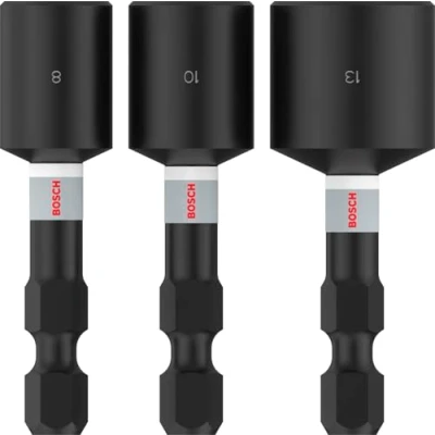 Made from heat-treated modified steel for strength and resistance to high torque Highly efficient for installers, electricians, metalworkers, and woodworkers: Robust 1/4" Impact rated Hex shank for use in impact driver and drill driver For fastening hex screws, nuts, and bolts efficiently, eg when installing all types of panels, equipment, and fixtures Scope of delivery: Bosch PRO Nutsetter Impact, 8 x 50, 10 x 50, 13 x 50 mm, 3 pcs, Weight: 0.2094391489 pounds, Manufacturer: Bosch