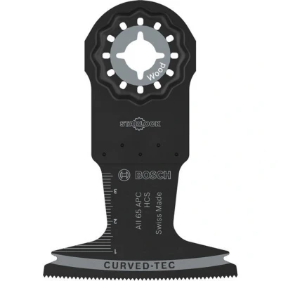 Features: Designed for cutting softwood Long Life cutting wood Plunge cuts are smooth and clean with a Curved-Tec blade. The teeth enter centre-first without chattering: This ensures delamination-free cutting while wear is distributed along the blade. Starlock mount for optimum power transfer and convenient blade change within 3 seconds The AII 65 APC Plunge Cut Blade allows carpenters and professionals in other trades to make wide plunge cuts in softwood, eg when cutting door frames or recesses in furniture components. The AII 65 APC features a rounded Curved-Tec cutting edge to help you make smooth wide plunge cuts through solid wood. The blade's flat design reduces wobbling. The body of this oscillating multitool blade has a tapered base to reduce jamming.