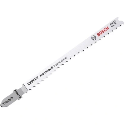 General description The Bosch EXPERT Hardwood 2-side Clean T308BFP Jigsaw Blade is designed for precision cutting in hardwood and laminated materials. This pack includes 5 blades that provide a perfect tear-free cut on both sides, thanks to their counter-directed teeth. They are robust enough to handle tough materials like laminated chipboard kitchen tops. Technical specifications Material: Bi-metal (high-speed steel bonded onto flexible steel) Type: T308BFP Jigsaw Blade Pack size: 5 blades Usage Ideal for tear-free straight cuts Suitable for accurate angle tear-free cuts