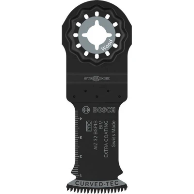 Features: Lasts up to 5x longer than a Bosch AIZ 32 BSPC Multitool Blade Long Life cutting hardwood and abrasive wood materials Coated with special formula for enhanced lifespan in tough materials. Combines hard teeth and flexible body through Bi-Metal welding: a hardened high-speed steel strip bonded onto a carbon steel body ensures the blade cuts hard and abrasive composite wood effectively. Plunge cuts are smooth and clean with a Curved-Tec blade. The teeth enter centre-first without chattering: This ensures delamination-free cutting while wear is distributed along the blade. Starlock mount for optimum power transfer and convenient blade change within 3 seconds The ideal problem-solving blade for professionals, the PRO AIZ 32 BSPIB combines great plunge cutting ability with a toughness that ensures it can cope with hardwood and wood-composites. The PRO AIZ 32 BSPIB Plunge Cut Blade is made from Bi-Metal for strength and endurance. It has coated Japan teeth, which make it extra
