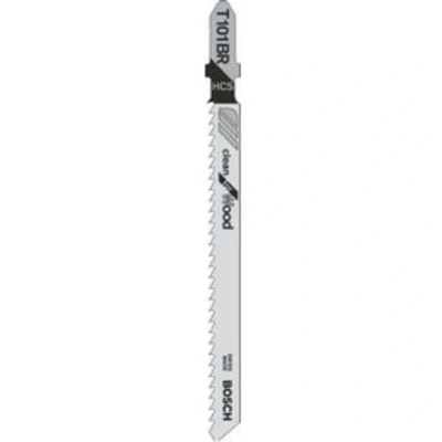 General description Bosch T101BR Jigsaw Blades are designed for clean cutting in wood materials. This pack includes 5 high-quality blades suitable for various applications, including softwood, chipboard, joiner boards, fiber boards (3-30 mm), laminated boards, and veneered panels. Technical specifications Length of blades: 100 mm Length of teeth: 74 mm Tooth spacing: 2.5 mm Material: HCS (High Carbon Steel) Tooth design: Reverse Tooth (angled down)