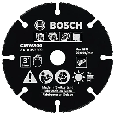 Carbide Multi-Wheel – allows angle grinders to cut material they couldn’t previously - wood, plastics, composites and more Carbide-grit edge – provides a long life because the grit is bonded to the steel wheel with laser-melting technology Thin wheel body – provides fast cuts in hard-to-reach areas and professional performance Optimal compatibility – designed to match with the Bosch GWS12V-30 3 In. grinder Functional applicability – compatible with standard 3 In. grinders and cut saws with 3/8 In. arbors