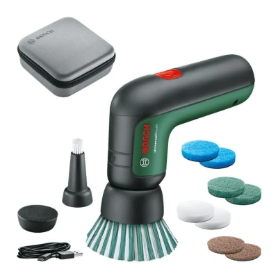 Bosch Electric Cleaning Brush Set UniversalBrush (for Bathroom Tiles, Kitchen Stove, Pans, Pots and More; 10 Attachments Included; 3.6V Integrated Battery; Micro USB Cable; in Soft Bag)