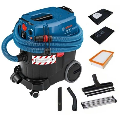 General description Bosch GAS 35 H AFC Professional H-Class Wet & Dry Vacuum is designed for efficient cleaning of both wet and dry materials. Its advanced safety filter traps 99.995% of harmful dust, providing a high level of health protection against carcinogenic and pathogenic dust, as well as organic materials like mould and construction materials such as glass fibre. The vacuum features an automatic filter cleaning mechanism to ensure uninterrupted operation and a volume flow control that monitors air flow, alerting users with an acoustic signal if the flow is too low. Technical specifications Input Power: 1,200W Tank Capacity: Wet 19.2 litres, Dry 35 litres Max. Airflow Rate (Turbine): 74 l/s Max. Vacuum Pressure (Turbine): 254 mbar Filter Surface Area: 5,000 cm² Suction Hose Nominal Width: 35 mm Weight: 12.4 kg Compatibility and accessories 1 x Antistatic Hose with Power Tool Adaptor (5m x 35mm Ø) 3 x Chrome-plated Suction Tube (0.35m, 35mm Ø) 1 x Floor Nozzle Set (35mm Ø) 1 x