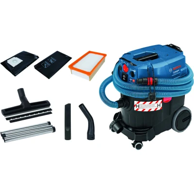General description The Bosch GAS 35 H AFC Professional H-Class Wet & Dry Vacuum is a powerful 1200 Watt dust extractor designed for both wet and dry applications. With a tank capacity of 35 litres, it effectively captures harmful dust and debris, ensuring a cleaner and safer workspace. Technical specifications Input Power: 1,200W Tank Capacity: Wet 19.2 litres, Dry 35 litres Max. Airflow Rate (Turbine): 74 l/s Max. Vacuum Pressure (Turbine): 254 mbar Filter Surface Area: 5,000 cm² Suction Hose Nominal Width: 35mm Weight: 12.4 kg Compatibility and accessories 1 x Antistatic Hose with Power Tool Adaptor (5m x 35mm Ø) 3 x Chrome-plated Suction Tube (0.35m, 35mm Ø) 1 x Floor Nozzle Set (35mm Ø) 1 x Crevice Nozzle (35mm Ø) 1 x Elbow 1 x H-class (HEPA), PTFE Flat-pleated Filter 1 x Safety Filter Bag 1 x PE Disposable Bag Installation No specific installation instructions provided. Usage This vacuum is designed for professional use, effectively handling both wet and dry materials. The