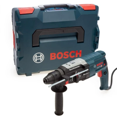 General description The BOSCH GBH 2-28 SDS-Plus Professional Rotary Hammer is a powerful tool designed for drilling and chiseling in various materials including concrete, masonry, wood, and metal. It features a robust motor that delivers 3.2 J of impact energy, ensuring high-performance drilling. The tool is equipped with multiple functions including reverse mode, rotation control clutch, variable speed, and Vario-Lock for enhanced versatility. Technical specifications Input Power: 880W Impact Rate: 0-4,000 bpm Impact Energy: 3.2 Joules Tool Holder: SDS-Plus Drilling Diameter: Concrete, Hammer Drill Bits 4-28mm (Opt.) Range: Concrete, Hammer Drill Bits 8-16mm; Concrete with Core Cutters 68mm; Metal 13mm; Wood 30mm Weight: 2.9 kg Compatibility and accessories Compatible with various dust attachments Supplied with: 1 x Auxiliary Handle 1 x Depth Stop 210mm 1 x Machine Cloth 1 x L-BOXX Inlay 1 x L-BOXX 136 Other information Features KickBack Control and Vibration Control for added user