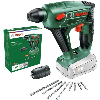 Features: The ultimate cordless 3-in-1 tool for extensive jobs Pneumatic hammer mechanism for easy and fast drilling also in concrete SDS-System chuck for intuitive and easy 3-seconds-fast accessory changes Compact and powerful for optimal handling and performance For hammering, drilling, and screwdriving in concrete, masonry, metal, wood and tile POWER FOR ALL: One battery and charger for an entire Home & Garden tools system The Uneo Maxx is the ultimate cordless tool for tough hammering, drilling, and screwdriving jobs. Powerful and compact, with an excellent performance in any material, this lightweight tool easily tackles every project from light screwdriving jobs to drilling in concrete. Powerful and compact, the 3-in-1 Uneo Maxx cordless rotary hammer drill is designed for the toughest hammering, drilling, and screwdriving jobs in concrete, masonry, metal, wood and tiles. A pneumatic Bosch hammer mechanism and strong motor enable easy and fast drilling in concrete up to 10 mm.