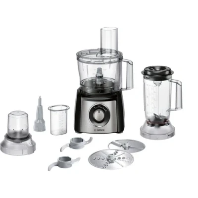 Process your ingredients The Bosch MultiTalent3 MCM3501MGB Food Processor has enough power to help you with any kitchen task. Chop your veggies, slice your fruits or grate the cheese. Mix your doughs and batters. And you can crush ice for your iced coffee too.You can process your way from various ingredients all the way up to wholesome meals. All with a single appliance. Powerful motor and hassle-free cleaning For everything to go smooth and fast, the MCM3501MGB Food Processor is driven by a powerful 800 W motor, so it won't stagger at tougher ingredients. Cleaning is fast and easy too, all the important bits can go into your dishwasher. Compact design With MultiTalent's compact size, it won't take up loads of space on your kitchen counter either. And for added convenience, you can store all its accessories within the mixing bowl.