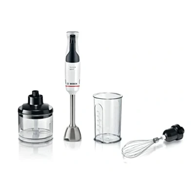 AntiSplash for task-free results: Enjoy perfect results without smudges. The bell is designed to direct the flow of liquid towards the center and thus reduce the risk of splashing while ensuring efficient mixing. Dynamic Speed Control for Comfort: Intuitive speed control just by the pressure of your fingers / The more you press the extra-large lever, the faster the mixer mixes. QuattroBlade Pro Mixing System: 4 ultra-sharp stainless steel blades and flow boosting bell. This is Bosch's best mixing performance. More control - less splashing. Ceramic connection between the motor and the foot: high resistance material without wear and tear - excellent durability. Items delivered: ErgoMaster Series 4 hand blender with chopper for vegetables, herbs, nuts and meat, measuring cup and whisk, Weight: 2.866009406 pounds, Manufacturer: Bosch Electroménager
