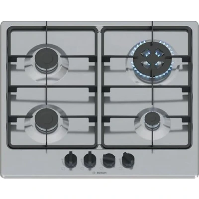 Bosch PGH6B5K60 Series 4, Gas Hob, 4 Burners, WOK Burner, Cast Iron Grills, Steel, 60 cm