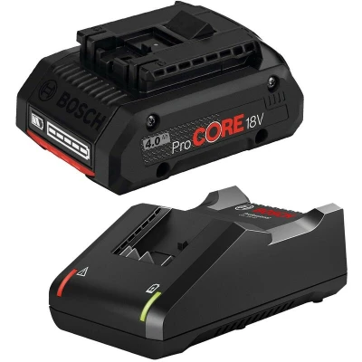 General description The Bosch 1600A016GB ProCORE GBA 18v 4.0Ah Lithium Ion Battery & Charger Kit offers enhanced power in a compact design. This battery delivers a constant power output even under full load, making it 100% compatible with all Bosch Professional 18v power tools and chargers. With advanced cell technology and intelligent battery management, it provides 87% more power and 135% longer life thanks to COOLPACK 2.0 technology that prevents overheating. Technical specifications Battery type: Lithium Ion Voltage: 18V Capacity: 4.0Ah Charging time: 24 minutes to 80% for 2.0Ah battery, 48 minutes to 80% for 4.0Ah battery Charger model: GAL18V-40 Charging current: 4A Compatibility and accessories Compatible with all Bosch Professional 18V batteries and chargers Part of the AMPShare multi-brand battery alliance Includes 1 x 18V ProCORE18V Battery 4.0Ah Li-ion Includes 1 x 18V GAL 18V-40 Professional Compact Charger Usage Ideal for use with Bosch Professional 18V power tools
