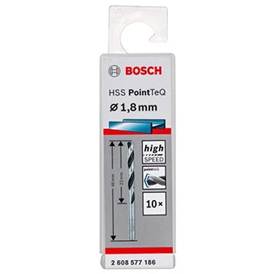 Saves time: The HSS Twist Drill Bit PointTeQ with reduced shank enables you to drill through metal quickly thanks to the special design of the drill bit tip High durability: The increased speed of the drill bit means less heat is built up, reducing wear Precision work: The self-centering PointTeq tip design prevents slipping and allows an easy and efficient start Compatibility: Suitable for all drill drivers, bench drills and rotary combi drills for making holes and centre holes through alloyed and mild steel, non-ferrous metals, cast steel, cast iron and plastic Scope of delivery: 10 x PointTeQ HSS Twist Drill Bit with round shank - 1.8 x 22 x 46 mm, Weight: 0.004629707502 Pounds, Manufacturer: Bosch