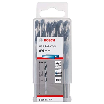 Saves time: The HSS Twist Drill Bit PointTeQ with reduced shank enables you to drill through metal quickly thanks to the special design of the drill bit tip High durability: The increased speed of the drill bit means less heat is built up, reducing wear Precision work: The self-centering PointTeq tip design prevents slipping and allows an easy and efficient start Compatibility: Suitable for all drill drivers, bench drills and rotary combi drills for making holes and centre holes through alloyed and mild steel, non-ferrous metals, cast steel, cast iron and plastic Scope of delivery: 10 x PointTeQ HSS Twist Drill Bit with round shank - 6 x 57 x 93 mm, Weight: 0.2976240537 Pounds, Manufacturer: Bosch
