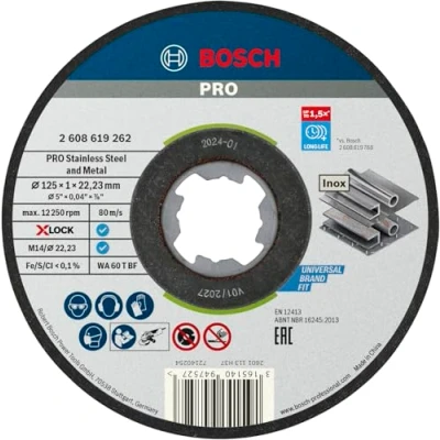 General description Bosch X-Lock Standard for Inox is a high-performance cutting disc designed specifically for stainless steel applications. With its innovative X-Lock system, it allows for quick and easy disc changes without the need for additional tools, enhancing efficiency and convenience during use. Technical specifications Diameter: 125 mm Thickness: 1 mm Inner diameter: 22.23 mm Material: Inox (stainless steel) Usage Ideal for cutting stainless steel, this cutting disc is suitable for various applications in metalworking and fabrication. It provides clean and precise cuts, making it a reliable choice for professionals and DIY enthusiasts alike.