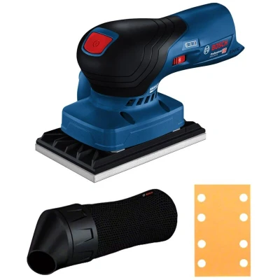 General description The GSS 12V-13 Professional Orbital Sander is the perfect tool for users on the go. It combines excellent balance with superior ergonomics, making it easy to handle and operate. Its compact 12V design allows access to hard-to-reach areas, while the intuitive operating concept and interchangeable sanding plate system enhance versatility. This sander is ideal for basic and in-between sanding, lacquer removal, and finishing surfaces on various materials including wood, veneer, lacquer, filler, mineral, and acrylic. Technical specifications Voltage: 12V Speed selection: Yes Battery status indicator: Yes Dust bag: Yes Interchangeable sanding plates: Three different sizes with hook-and-loop fastening system Compatibility and accessories Compatible with Bosch Click & Clean dust extraction system Part of the Professional 12V system
