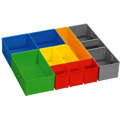 General description The 10-piece i-Boxx 72 inset box set provides flexible storage solutions in accordance with the Bosch Mobility System. This set includes 10 colored boxes in various sizes, designed for optimal organization and easy access to small items such as accessories and consumables. The Inset Box Set is specifically designed to fit the i-Boxx 72, ensuring maximum versatility for your storage needs. Technical specifications Number of boxes: 10 Compatibility: Fits i-Boxx 72