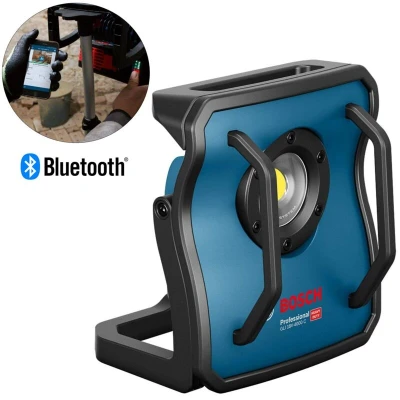 General description The Bosch GLI 18V-4000 C Professional is a powerful and durable cordless jobsite light designed for professional use. With its high-power LED, it delivers an impressive brightness of up to 4000 lumens, making it ideal for illuminating large work areas. The robust construction features a solid metal body protected by a shock-absorbing rubber frame and heavy-duty safety bars, ensuring it can withstand tough jobsite conditions. Additionally, it includes a user-friendly interface with brightness and charge level indicators, as well as Bluetooth connectivity for remote control and lighting adjustments through the MyTools tile in the Toolbox app. Technical specifications Brightness: Up to 4000 lumens Power source: 18V battery (compatible with all Bosch Professional 18V batteries and chargers) Construction: Solid metal body with shock-absorbing rubber frame Features: Three brightness settings, flexible adjustment angles, 5/8" tripod thread