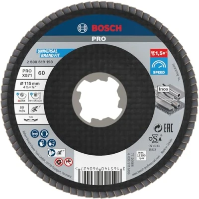 Up to 1.5x faster than a Bosch X431 Flap Disc Highly efficient for metalworkers: Speed Click it on with X-LOCK or use it with nut and thread angle grinders For grinding metal, eg when removing welds and stock on mild steel and stainless steel Scope of delivery: Bosch PRO X571 X-Lock Flap Disc, 115 mm, G60, Weight: 0.16093745126 Pounds, Manufacturer: Bosch