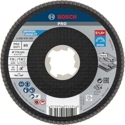 Up to 1.5x faster than a Bosch X431 Flap Disc Highly efficient for metalworkers: Speed Click it on with X-LOCK or use it with nut and thread angle grinders For grinding metal, eg when removing welds and stock on mild steel and stainless steel Scope of delivery: Bosch PRO X571 X-Lock Flap Disc, 115 mm, G80, Weight: 0.14550509292 Pounds, Manufacturer: Bosch