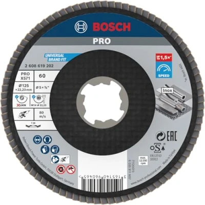 Up to 1.5x faster than a Bosch X431 Flap Disc Highly efficient for metalworkers: Speed Click it on with X-LOCK or use it with nut and thread angle grinders For grinding metal, eg when removing welds and stock on mild steel and stainless steel Scope of delivery: Bosch PRO X571 X-Lock Flap Disc, 125 mm, G60, Weight: 0.18518830008 Pounds, Manufacturer: Bosch