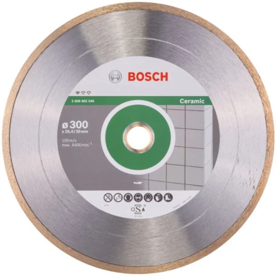 Features: Reliable Cuts in Tiles Standard for Ceramic Diamond Cutting Disc provides reliable cuts in tiles With 25.4 mm bore, fits 20 mm bores with reduction rings High-quality standards ensured by Bosch diamond competence centre in Switzerland The Standard for Ceramic Diamond Cutting Disc provides reliable cuts in tiles. Its continuous cutting rim achieves accurate results in all sorts of tiles. Additionally, the disc's high-quality standards are ensured by the Bosch diamond competence centre in Switzerland. Use this disc for cutting ceramics, porcelain and fine stoneware.