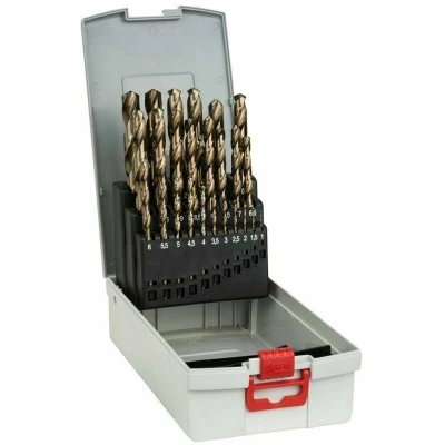 AmazonThe Professional 25pc. HSS-Cobalt ProBox Metal Drill Bit Set from Bosch - long-lasting performance when drilling stainless steel Cobalt alloy and fully ground HSS provide wear resistance and heat protection. Two cutters and two flutes remove chips quickly to make the bits last even longer Cylindrical shank compatible with three-jaw drill chucks Ideal for drilling holes into stainless steel Scope of delivery: 25 x Bosch Professional HSS-Co Twist Drill Bits for stainless steel - Ø 1/1.5/2/2.5/3/3.5/4/4.5/5/5.5/6/6.5/7/7.5/8/8.5/9/9.5/10/10.5/11/11.5/12/12.5/13 mm, Weight: 2.624 pounds, Manufacturer: Bosch