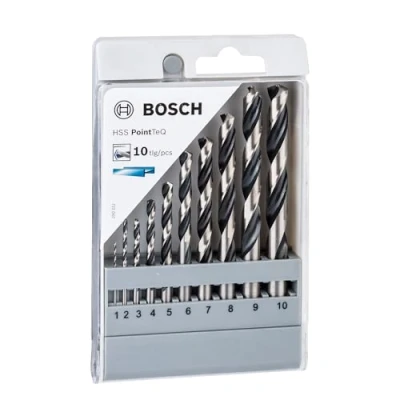 General description This HSS PointTeQ range of metal drill sets from Bosch is designed for professionals seeking efficiency and speed in their work. The self-centering drill bit prevents slipping on the workpiece, ensuring quick and easy pilot drilling. This results in a faster drilling rate compared to standard metal drills, making it suitable for various applications such as clearance holes for screws, cable and pipe transits, and core holes for threads and rivet joints. The oxide-coated drill flute reduces friction, enhancing chip removal and overall drilling ease. Technical specifications Contents: 1.0/2.0/3.0/4.0/5.0/6.0/7.0/8.0/9.0/10.0mm Drill Bit Type: Drill Bit Set Drill Diameter: 1-10mm Max. Drill Size: 10.0mm Number of Pieces: 10 Pack Quantity: 10 Shank Type: Straight System of Measurement: Metric MPN: 2608577348 EAN: 3165140917667 Other information