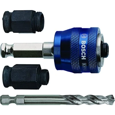 Starter Kit for easy and quick conversion of all standard hole saws with threaded mounting to the Power Change Plus System incl. easiest drill core removal Allows use of the Bosch quick-change interface for all hole saws from other manufacturers with threaded mounting. Compatible with all cordless and mains drill drivers Very fast drill core removal: unlock, tilt, push out. Done! Tool-free! Areas of use: wood, drywall, plastics, metals, nonferrous metals and stainless steel Includes: 1 x adapter nut for hole saws Ø 14-30 mm (1/2"-20UNF thread), 1 x adapter nut for hole saws Ø 32-210 mm (5/8"-18UNF thread), 1 Power Change Plus adapter 11mm hexagonal shank, 1 x centre drill bit HSS-G 85mm for hole saws with cutting depth < 44mm, Weight: 0.5070632026 pounds, Manufacturer: Bosch