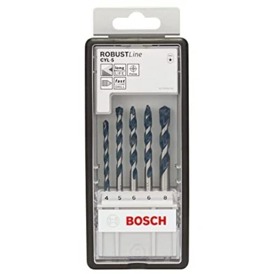 ManoManoLong Life for Concrete and Stone. CYL-5 Drill Bit guarantees extra-long durability when drilling holes for fixings in concrete and stone. Bosch's carbide blend and diamond-ground cutting edges make the bit wear-resistant. Reduced friction from 2-flute vario design providing dust removal and wear reduction. Bosch Power Grip Shank System enables direct use of power. Features 5-piece Robust Line CYL-5 concrete drill bit set CYL-5 Drill Bit guarantees extra-long durability when drilling holes for fixings in concrete and stoneDiameter mm: 4,0, 5,0, 6,0, 6,0, 8,0Dimensions set mm: 156,5 x 69,5 x 21,5 Overall length mm: 90, 100, 100, 100, 100 Useful length mm: 50, 50, 50, 50, 50