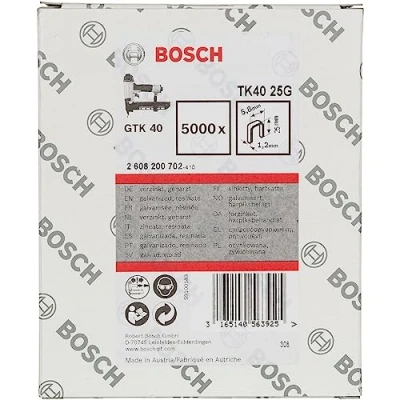 AmazonGalvanised Version, Resin Coated, With Chisel Point 1.2/18g Narrow Crown Staples are resin coated and come with chisel point: ideal fasteners in interior fitting applications Equipped for attaching heat insulation materials, fibre plasterboard, upholstery, steps and handrails For building fences, for door, window and picture frames and for securing wooden floors Scope of Delivery: 5000x Staples Type TK40 25G, Width 5.8mm, Thickness 1.2mm, Length 25mm, Weight: 4.4974301448 pounds, Manufacturer: Bosch