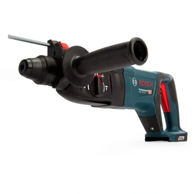 For those seeking cordless functionality, the Bosch GBH 18V-26 D is a D-handled cordless rotary hammer that excels in vertical drilling and chiselling applications using the SDS Plus system. Powered by a maintenance-free brushless motor, it delivers an impressive 2.5 Joules of impact energy, comparable to corded tools. This model features a KickBack Control system for enhanced user protection and a brighter LED light to illuminate dark work areas. Compatible with Bosch's 18V professional battery system, this tool offers exceptional versatility in power and application.