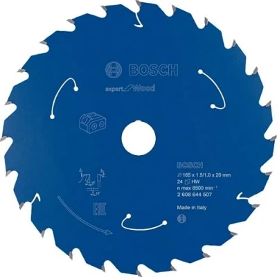 General description The BOSCH Expert for Wood Circular Saw Blade (2 608 644 507) is designed to maximize the battery runtime of cordless saws. Its extra-thin kerf and aggressive tooth angles minimize friction and material removal, allowing for effortless and smooth sawing. This blade is up to 30% thinner than standard Expert blades while maintaining superior durability and performance. Technical specifications Diameter: Ø 165 mm Bore: 20 mm Number of teeth: 24 Compatibility and accessories Fits all common cordless plunge and handheld saws Compatible with cordless dry-cutters Other information MicroteQ carbide teeth for high durability Anti-corrosive ProteQtion coating reduces friction and prevents rust Ideal for cutting all kinds of wood and wooden materials