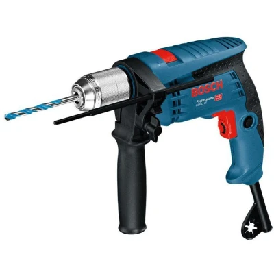 General description The Bosch GSB 13 RE Impact Drill is a powerful and versatile tool designed for both professional and DIY use. It features a robust, twin-sleeve keyless 13mm chuck made of metal for quick and easy accessory changes. Weighing only 1.6kg, it is compact and easy to handle, making it ideal for various drilling tasks. Technical specifications Input Power: 600W (110V) No Load Speed: 0-2,800 rpm Impact Rate: 0-44,800 bpm Torque: 10.8 Nm Chuck Capacity: 1.5 to 13 mm Chuck Type: 13mm Keyless Drilling Capacity: Concrete: 13mm, Masonry: 15mm, Steel: 10mm, Wood: 25mm Weight: 1.6 kg Compatibility and accessories Includes Auxiliary Handle Carry Case Depth Stop (210mm) Installation No specific installation instructions provided. Usage The Bosch GSB 13 RE Impact Drill is suitable for various applications, including drilling into concrete, masonry, steel, and wood. It features electronic control for precise pilot drilling and a speed pre-selection setting wheel for working with