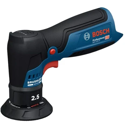 General description The Bosch GEX 12V-77 Orbit Sander is designed for efficient spot sanding, providing excellent surface finishes. It features a powerful Bosch Professional 12V system and a brushless motor for strong performance. Its compact shape and comfortable grip ensure excellent ergonomics, making it easy to handle during use. The tool is equipped with a Human-Machine Interface (HMI) for convenient operation, allowing for easy speed adjustments and battery status indication.