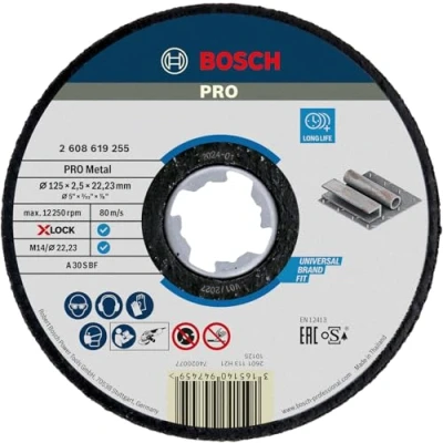 Designed for cutting metal Highly efficient for metalworkers: Long Life With 22.23 mm bore for standard locking nut angle grinders For cutting metal in general metalworking applications Scope of delivery: Bosch PRO Metal X-Lock Cutting Disc, 125 x 2.5 x 22.23 mm, Weight: 0.1322773572 pounds, Manufacturer: Bosch