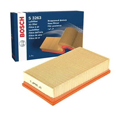 Helps prevent air leakages: With matching seals and a precise fit, the filter blocks contaminants and avoids annoying leaks High tensile strength and resistance to moisture: Thanks to the filter media properties, the filter can withstand exposure to humidity without losing its effectiveness or structural integrity Built to last: The flat panel design ensures even airflow and maximum surface contact, giving the filter excellent dust-holding capacity and durability High standards: The dust holding capacity, filtration efficiency plus all function and quality tests are performed in accordance with international standards Works under tough conditions: The air filter withstands heat and pressure Compatibility: Use the vehicle identification number in the parts' search function to find the right air filter for your vehicle Installation: All assembly work should be carried out by trained professionals Scope of delivery: 1 Bosch S3263 Air Filter - Packaging dimensions: Height 57.6 mm, Length 281.5 mm, Width 159 mm