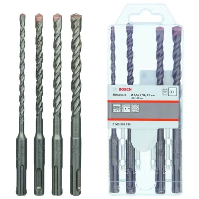 General description The Bosch Professional 2608578738 SDS Plus 4PC Drill Bit Set is a versatile collection of drill bits designed for drilling into concrete and masonry. This set is suitable for both DIY enthusiasts and professionals, ensuring precise drilling with tight tolerances. Technical specifications Sizes: 4mm, 5.5mm, 7mm, 8mm, 10mm Material: High-alloy steel Design: 4-flute dura design for effective dust removal Other information Each bit features the PGM Masonry Drill Bit Association Board test mark Supplied with: 1 x Bosch 2608578738 SDS Plus 4PC Drill Bit Set