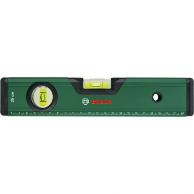 Features: Precise alignment and metric measuring with 2-in-1 spirit level Highly accurate, easy-read, horizontal and vertical fluorescent bubble levels Additional measuring capability thanks to 0-22 cm metric scale Measures from flat and curved surfaces with V-Groove on plane-milled bottom Tool and work area protection thanks to robust end caps and soft-grip stoppers Robust, light aluminium tool with reinforced ribs and handy hanging hole For fast and precise alignment and positioning of pictures, mirrors, or other objects, the Bosch Spirit Level 25cm should be in every DIY tool set. This light and robust spirit level is highly accurate, has two fluorescent bubbles, and a handy metric scale. With the Bosch Spirit Level 25cm, shelves and pictures are hanging straight in no time. This handy all-rounder delivers highly accurate results up to 0.05 mm/m thanks to horizontal and vertical bubble levels. Reading the level is easy, due to the bright fluorescent bubble liquid in the vials. This